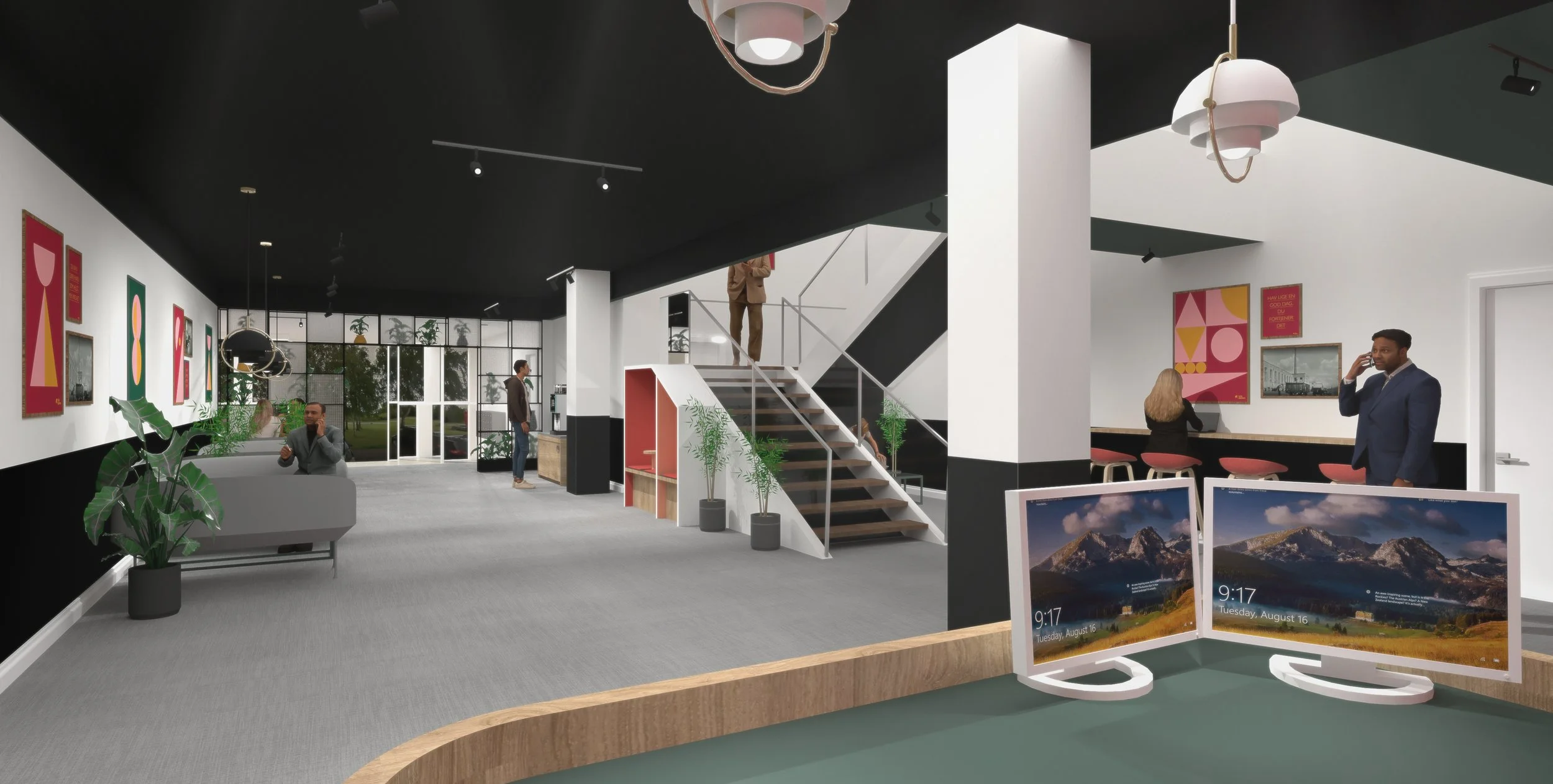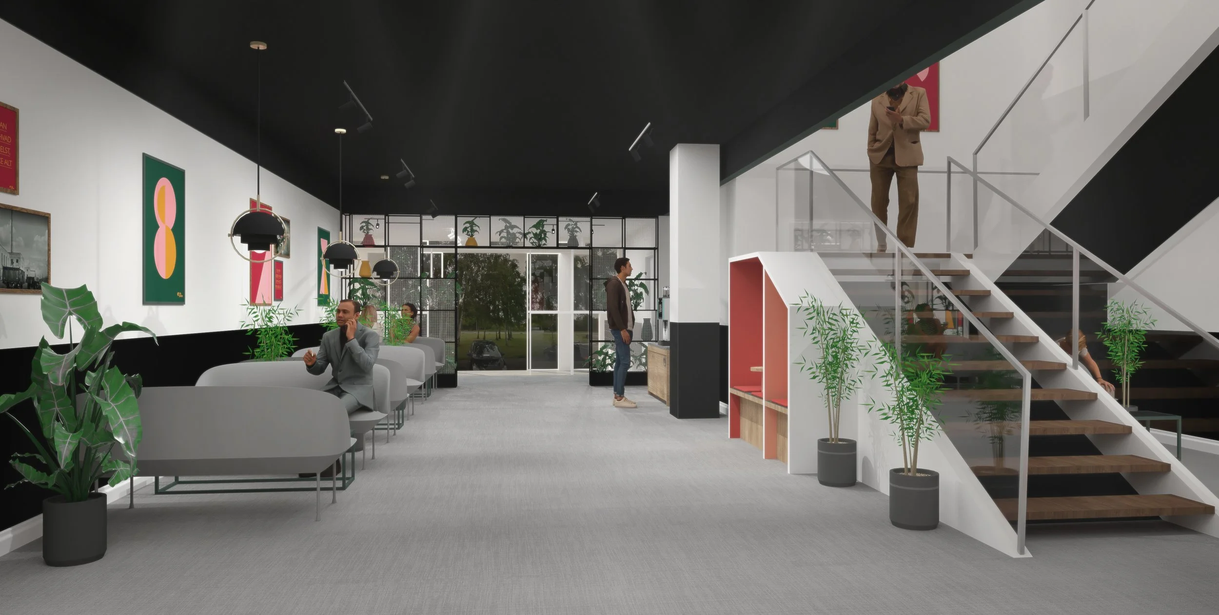 The lobby where visitors arrive and office tenants hang out for breaks, meetings and lunch was a key area, hence the first space to develop and implement the new distinct interior concept.